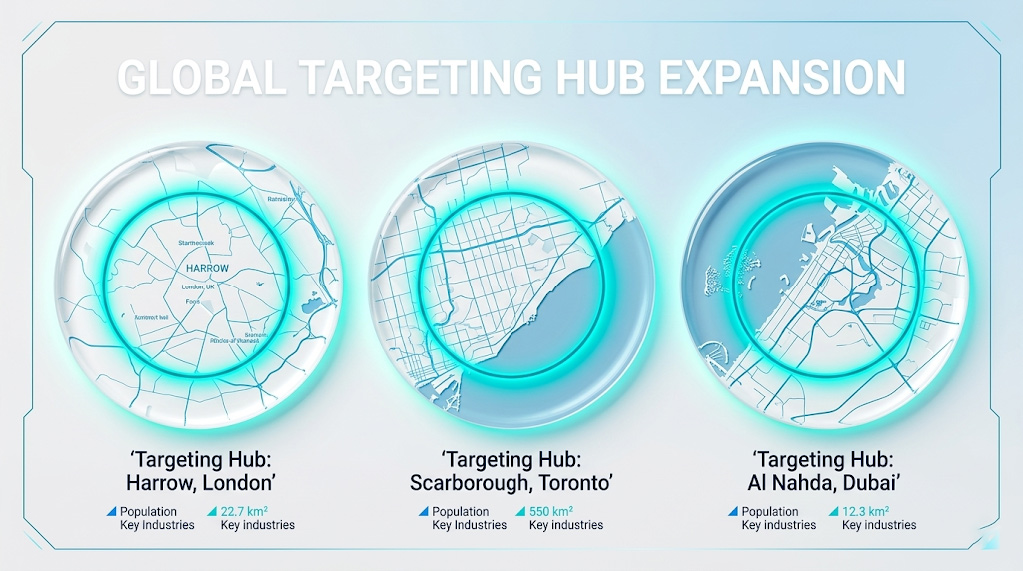 | United Kingdom | London, Leicester, Birmingham | Harrow, Redbridge, Newham, Tooting, Wembley | Hyperlocal geofencing + professional B2B |