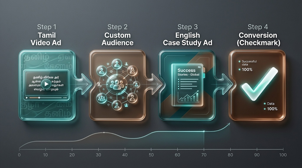 Use the ‘Language Bridge’ approach: start with a cultural Tamil video ad to build awareness, then retarget viewers with a professional B2B offer in English. This mirrors the community’s bilingual identity and typically improves conversion rates.