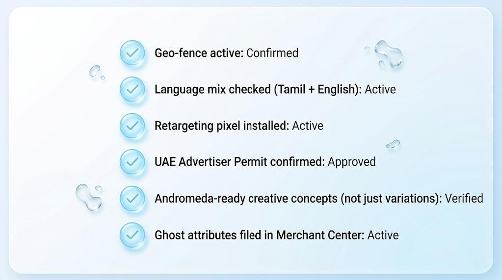 Start this week: test one UK and one Canadian audience segment simultaneously. Track which country converts first. Ensure your UAE permit status is confirmed and your Merchant Center product attributes are complete for AI commerce eligibility. Build local trust today to win the global Tamil market tomorrow.